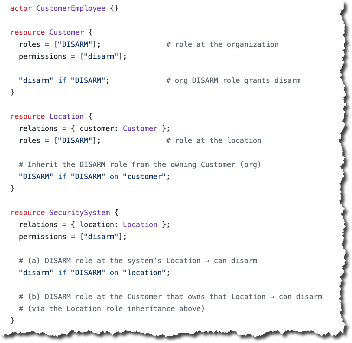 - Defines an Oso Cloud policy document which captures the authorization rules for who can disarm a security system in the RealGuardIO application